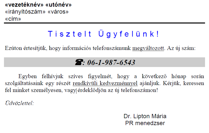Az adatforrás felhasználásával készítsen a dokumentumból körlevelet! A levélben (a mintában feltüntetettek szerint) szerepeljen a név és a cím! Mentse el a törzsdokumentumot 48. ECDL szövegszerkesztés törzsdokumentum néven!